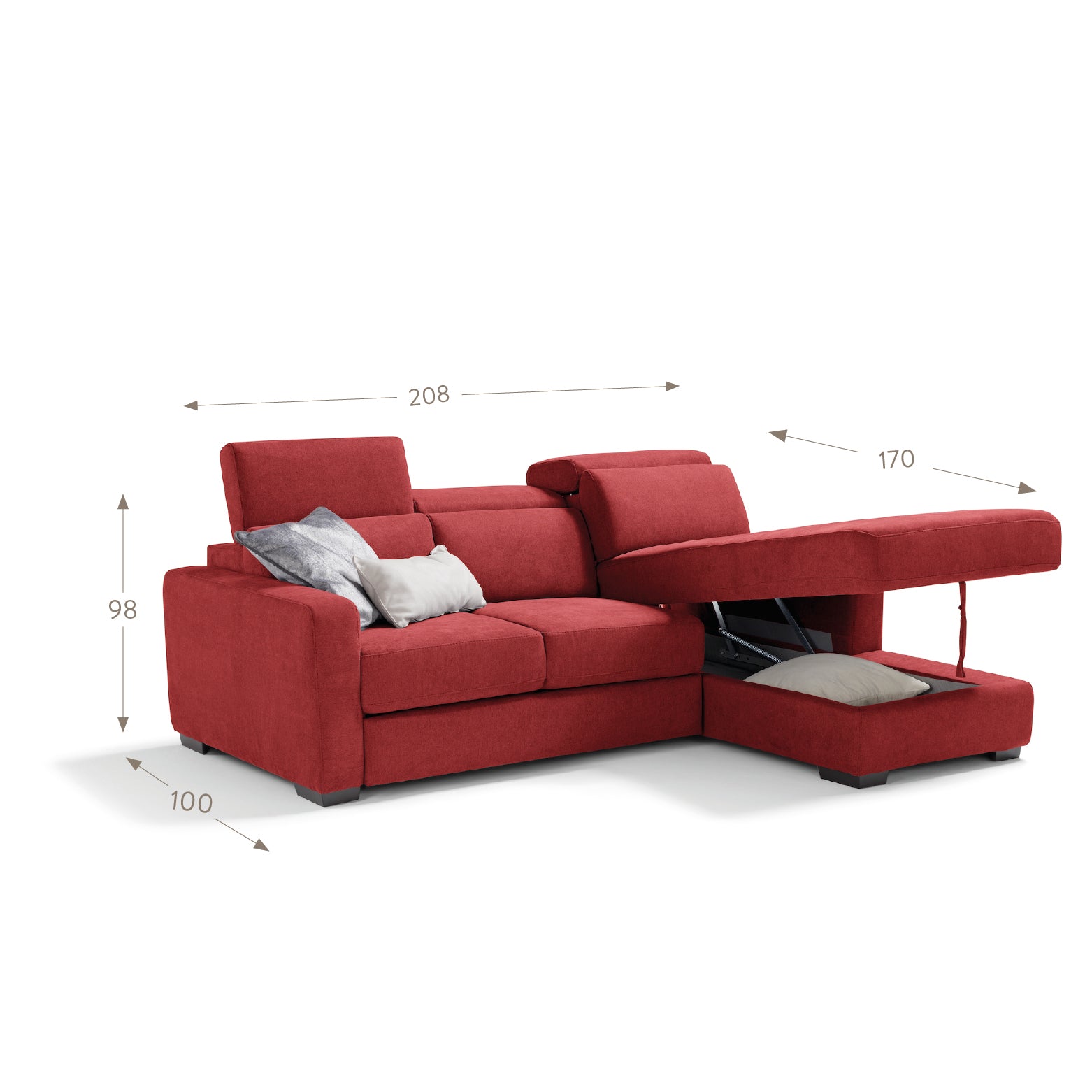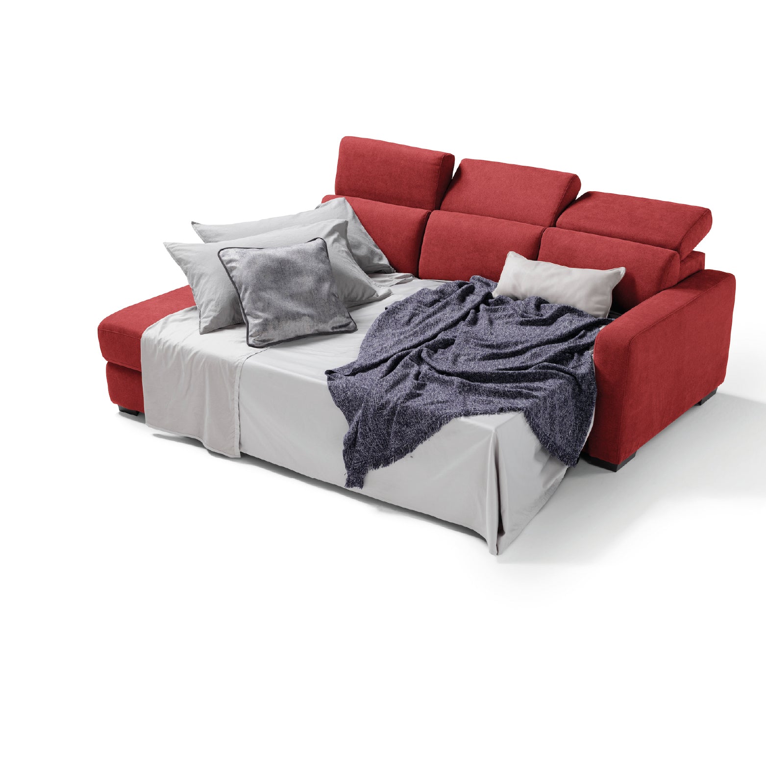 TALENTO by Komodo 3 seater Max is the chaise longue sofa with the best quality-price ratio. It is equipped with 4 manually adjustable headrests designed for maximum comfort of the cervical area. The 4 practical poufs placed in the lateral section of the sofa give it a contemporary design, at the same time useful as extra seats. A practical pull-out trolley transforms it into a sofa bed in a few seconds. The composition is completed by a practical fixed chaise longue (included in the price) or container (with an extra €150).