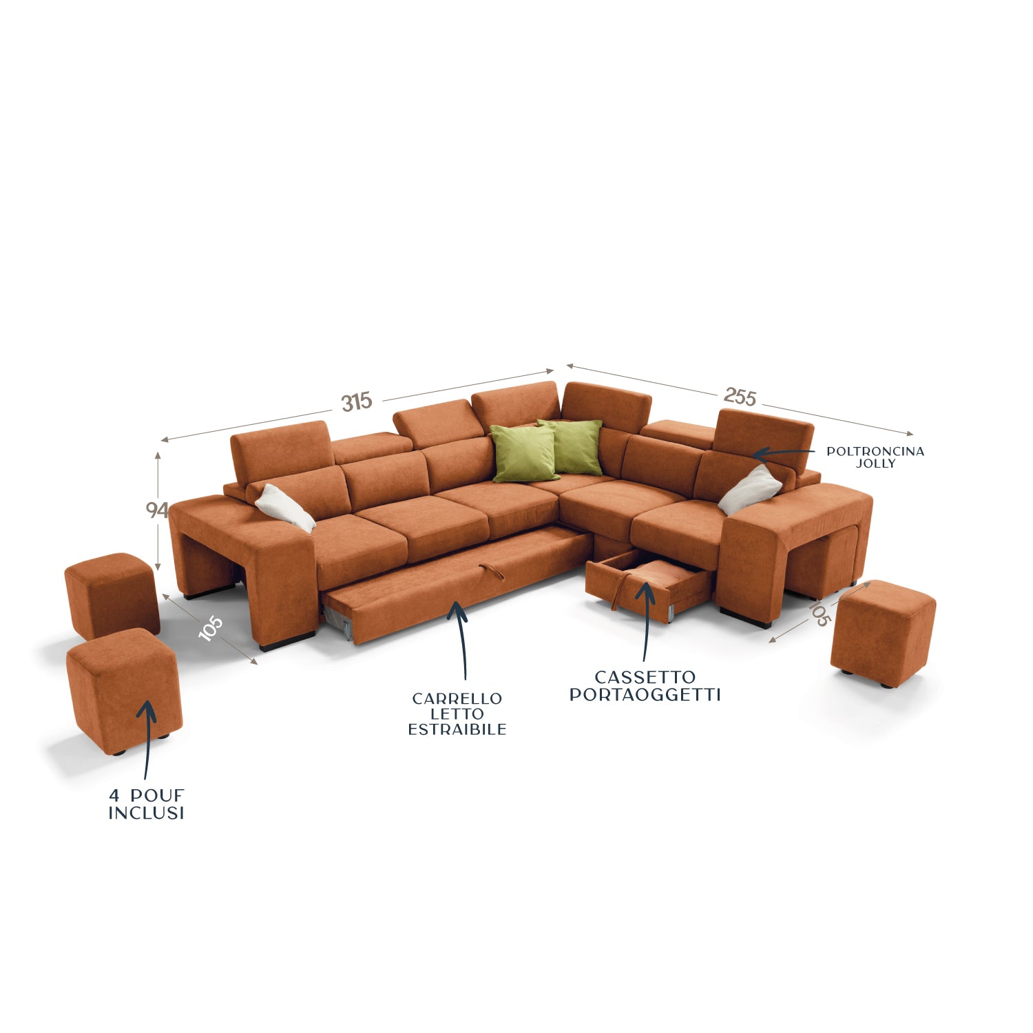 With pull-out bed trolley, 4 poufs, armchair, storage compartment