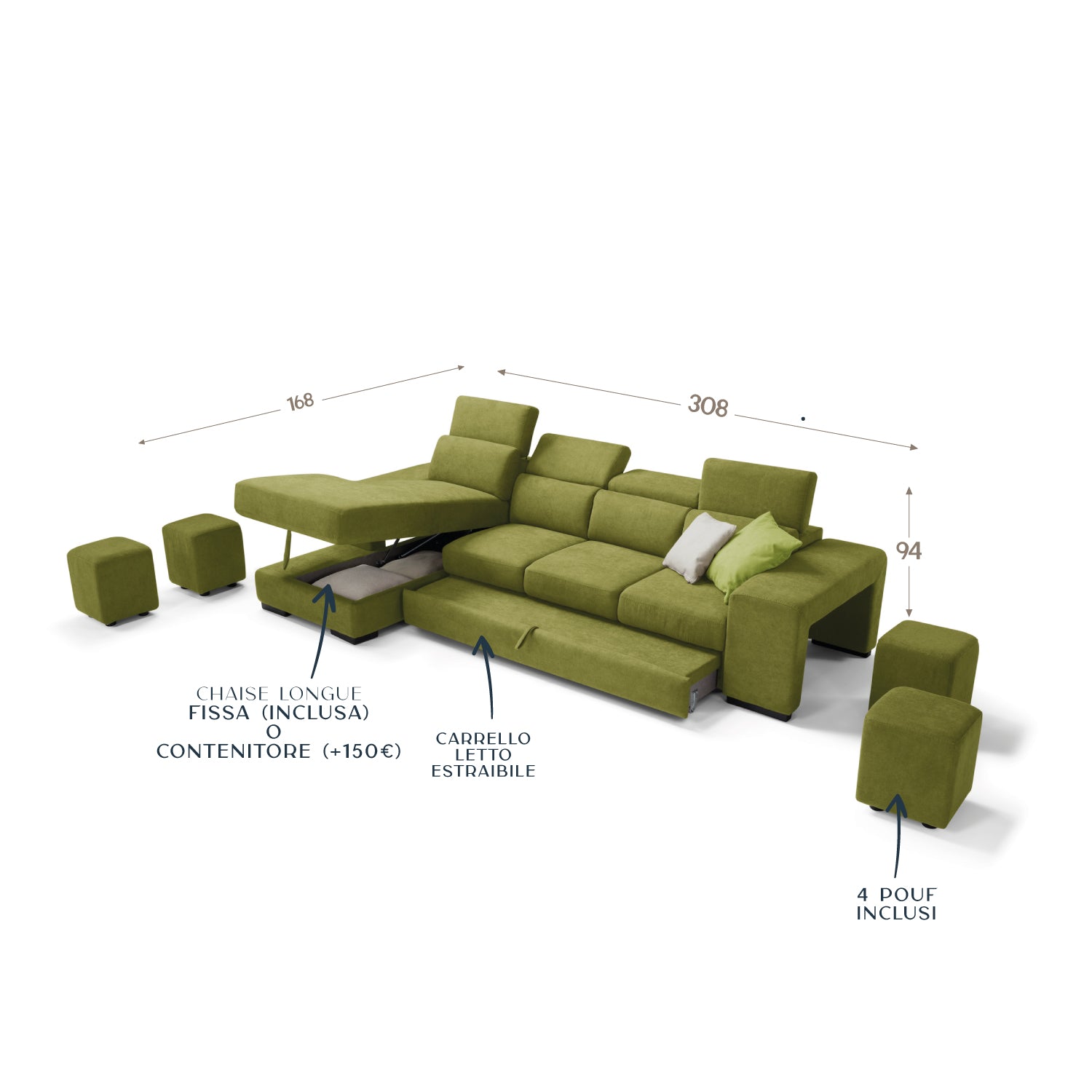 Le canapé 3 places TALENTO by Komodo Max offre un excellent rapport qualité-prix. Il est doté de quatre appuie-têtes réglables manuellement pour un confort optimal de la nuque. Ses quatre poufs pratiques, situés de part et d'autre du canapé, lui confèrent un design contemporain tout en offrant des assises supplémentaires. Un chariot coulissant permet de le transformer en canapé-lit en quelques secondes. L'ensemble est complété par une méridienne fixe (incluse dans le prix) ou une méridienne de rangement (en option à 150 €).