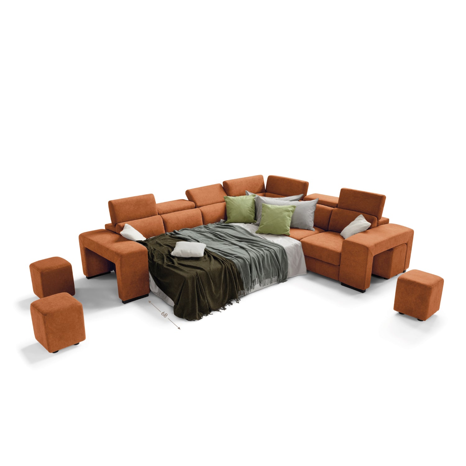 TALENTO de Komodo est le canapé d'angle max 3 places avec le meilleur rapport qualité-prix. Il est équipé de 7 appuis-tête réglables manuellement conçus pour un confort maximal au niveau cervical. Les 4 poufs pratiques situés dans la partie latérale du canapé lui confèrent un design contemporain, tout en étant utiles comme siège d'appoint. Un chariot extractible pratique le transforme en canapé-lit en quelques secondes. La composition est complétée par un tiroir de rangement placé sous le fauteuil Jolly.